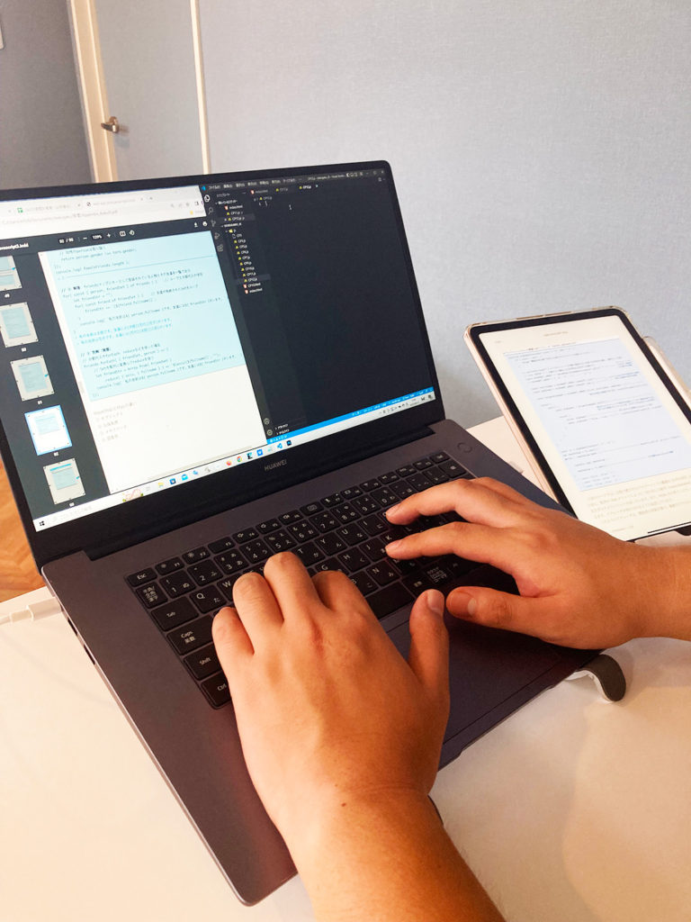 まずは、自力で一からホームページ制作を目指しているYさん。現在「JavaScript」というプログラミング言語を学習しています。「JavaScript」とは、広く知られているプログラミング言語ですが、例えば”クリックをしたらサイコロがふられる”や”文字が変化する”といったホームページに多彩なアクションを実装する際に用いられることが多いです。