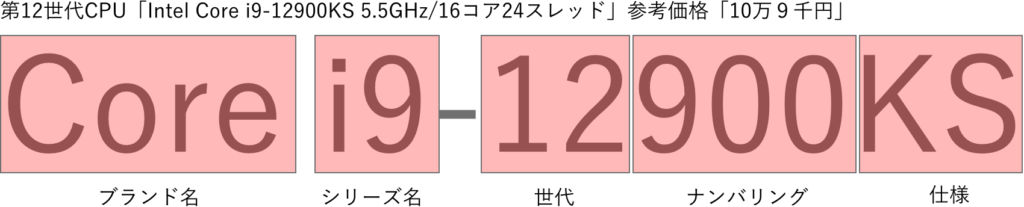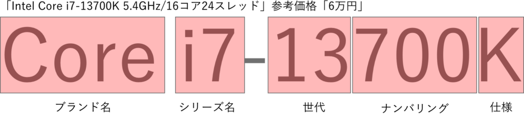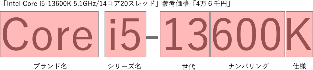 「ナンバリング」は「同じシリーズで同じ世代」の製品の性能の差を表したもので、「Core i5で12世代」のCPUでも「600」「500」「400」とあり数字が高い方が性能が良いです。