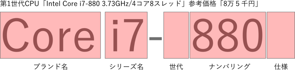 第1世代CPUでの最上位モデルは「i7-880」が4コア8スレッド/定格3.06GHz(最大3.73GHz)の性能でした。