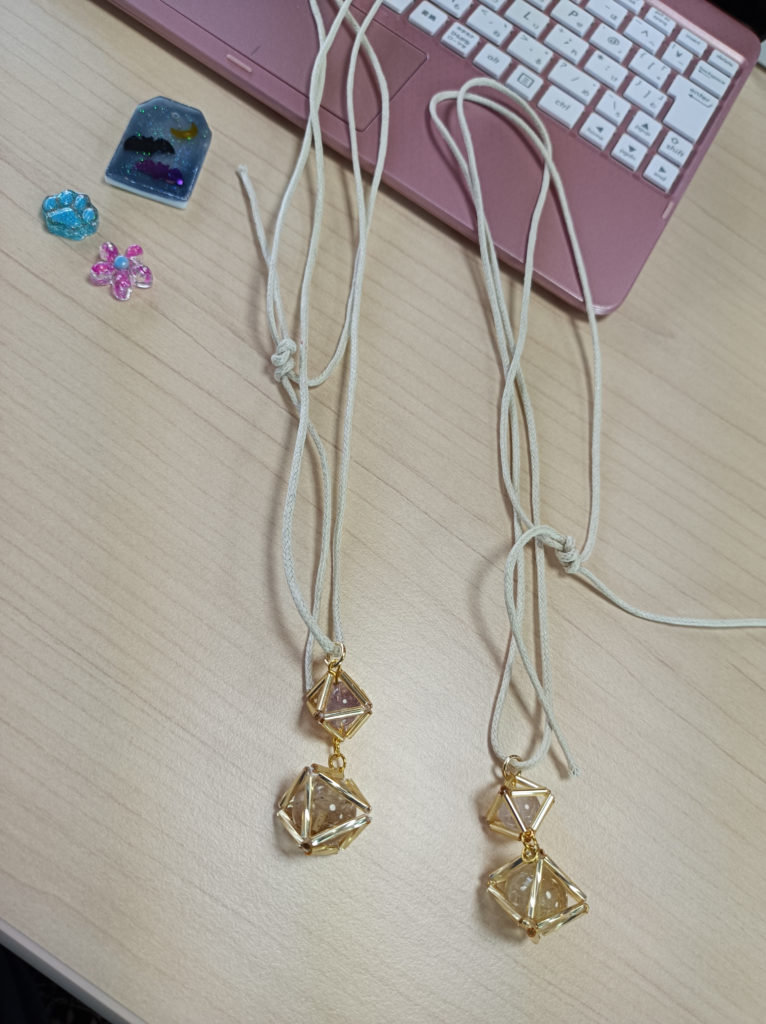 大きさの異なるアクセサリーを2つ組み合わせ、紐に括り付けて…